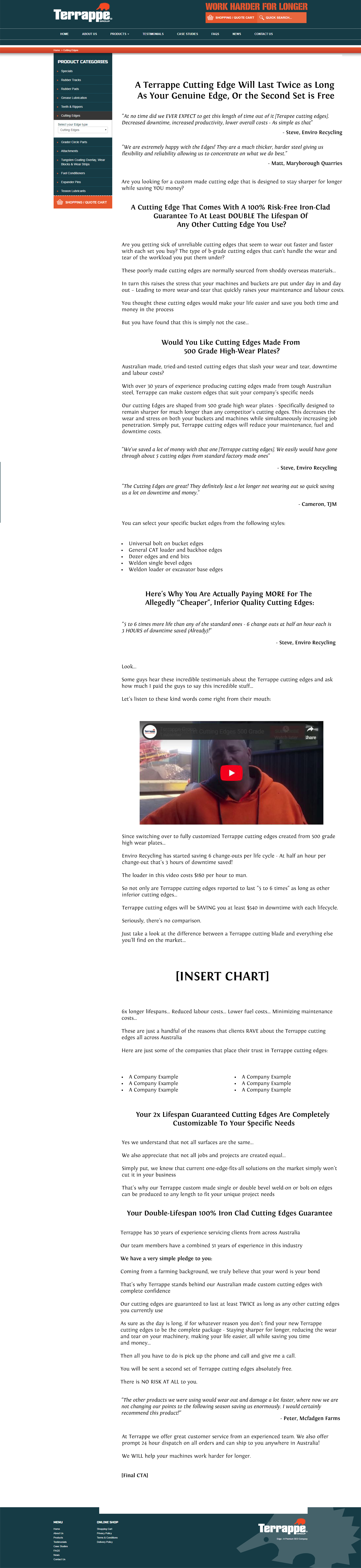 2) Another landing page example that shows almost anything can be written about and sold in an interesting way, as long as you understand the principles of direct response copywriting, and can unearth the selling-message behind a product. The client is selling 100% Australian-made machinery “cutting edges” that come with an industry-leading guarantee and warrantee.