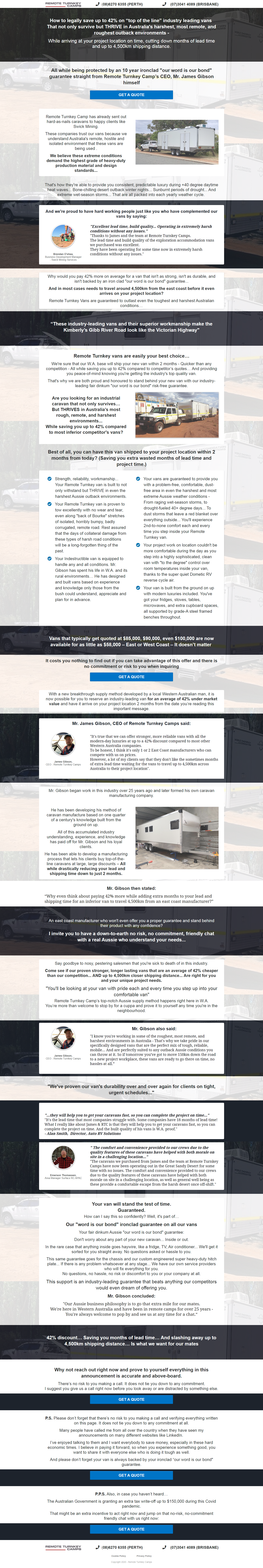 1) Estonian master-marketing and Dan Pena disciple Maksims Kornev needed a landing-page written for mining caravans sold to companies who are working year-round in the hard outback locations around Australia. It was a pleasure putting together copy for such a different and interesting project. Having travelled to most of these remote, outback locations earlier in my life, this project was breath of fresh air that let me relive memories from a fantastic time in my life. Don’t judge the page design, I had nothing to do with it!