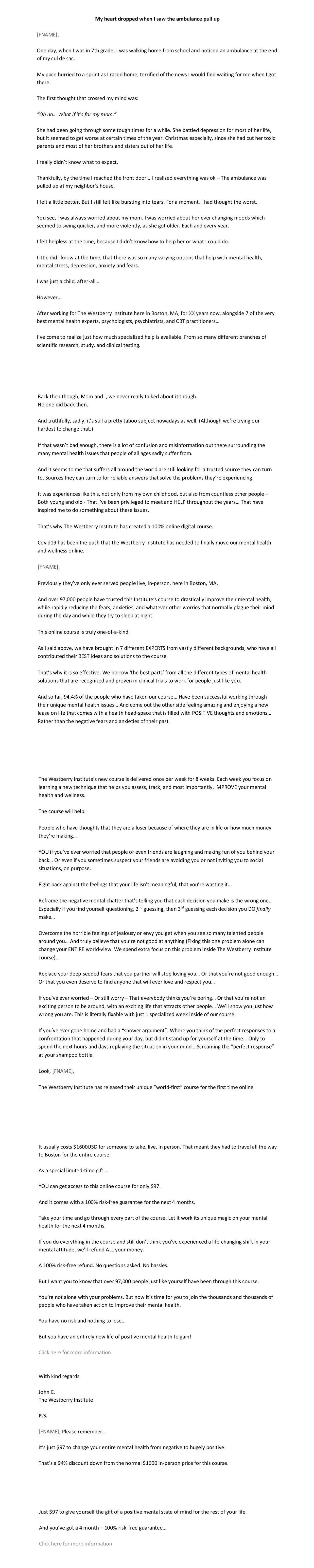 2) The Westberry Institute, out of Boston MA, have for the first time ever, launched their world-famous mental health and wellness course online in a digital format. They needed a 10-part email auto-responder campaign set up to entice their leads into purchasing this amazing online course that has helped over 97,000 patients already. I’ve attached 2 email samples below.