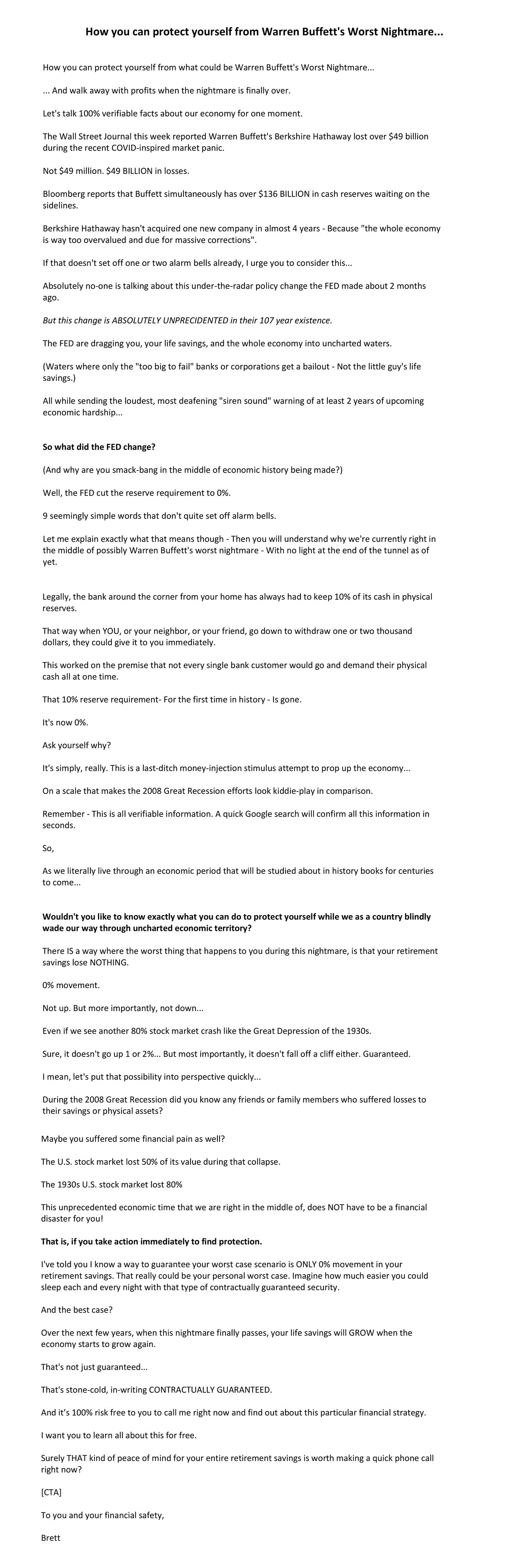 1) Brett Kitchen and Ethan Kap of Wealth Beyond Wall-Street, and retirement annuity experts who regularly spend over $1,000,000/year on direct response advertising alone, needed an 8-piece email broadcast sequence to hammer their email list with. These emails were designed to almost force leads to raise their hand and request a meeting with retirement annuity agents who regularly close $15,000, $25,000, even $50,000 or more, commissions.