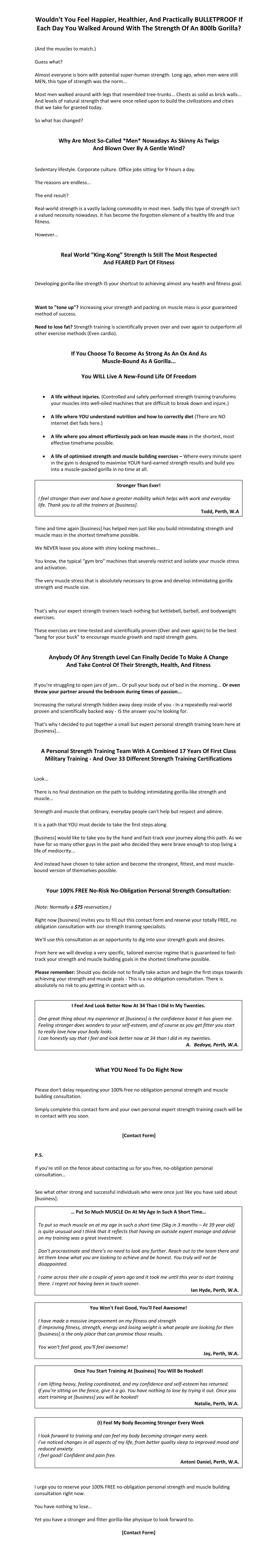 4) A Perth, Western Australia, based gym needed a complete overhaul of the website and landing-pages that were designed to generate new clients for personal fitness classes and personal trainers. I’ve attached the copy of 2 different pages, one for strength-training, and the other for weight-loss.